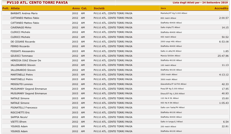 A fronteggiarsi saranno le migliori 12 squadre al maschile e le migliori 12 al femminile, la 100 torri si presente con il vivaio al completo, tra i nomi da tenere d’occhio spicca quello dell’ormai conosciuto Emmanuel Musumary (Campione Italiano lancio del peso indoor 2019 ) che ha fatto parlare di sè poche settimane fa vincendo il campionato regionale allievi/e a Saronno, scagliando il suo attrezzo prima a 17m72 poi a 17m95 ( migliorando di oltre 1m il suo PB) ed registrando la seconda migliore prestazione italiana U18 del 2019 dietro a Patrick Olcelli.